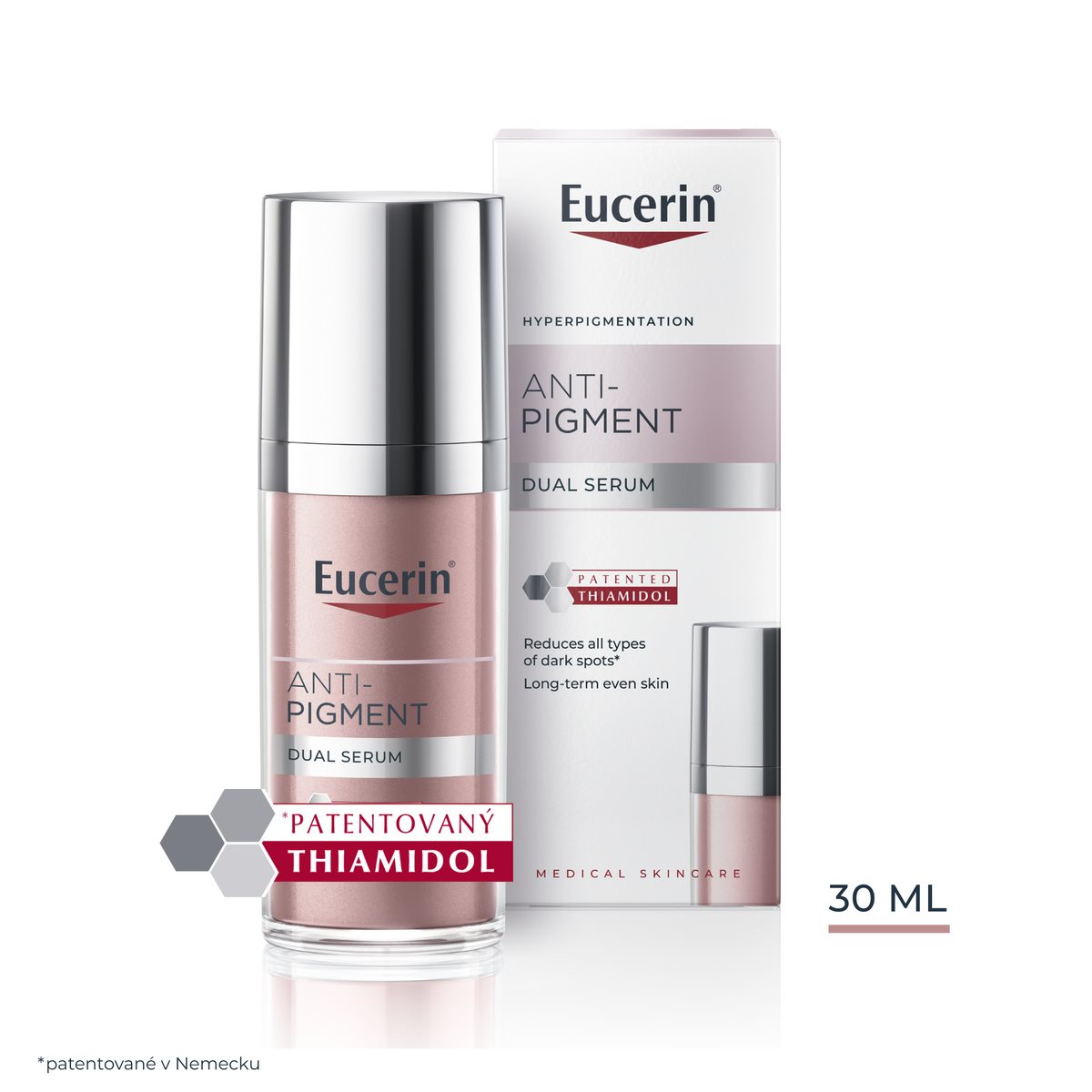 Eucerin® Anti-Pigment Sérum s duálnym účinkom vo svojej pôvodnej dvojkomorovej forme preukázalo svoju účinnosť. Napriek tomu neustále pracujeme na zdokonaľovaní a vylepšovaní našich produktov – a teraz sme našli spôsob, ako kombinovať obe účinné látky v jednej komore tak, aby boli dávkované presne v správnom množstve. Nové jednokomorové balenie je logickým dôsledkom nášho vývoja produktov: jeho použitie je ešte pohodlnejšie. Nové obaly navyše prinášajú vyššiu udržateľnosť. Nový výrobok sa na pleti ľahko rozotiera a rýchlo sa vstrebáva.