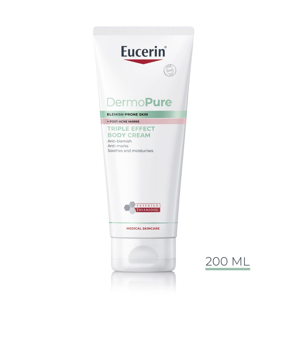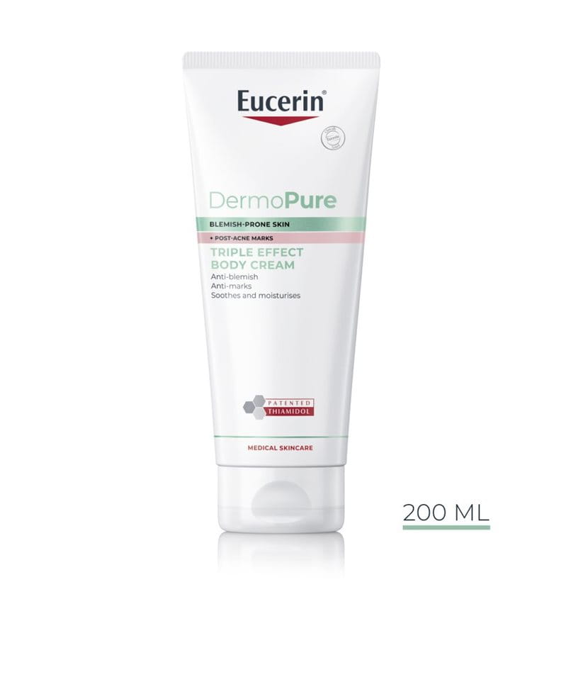 Eucerin DermoPure Telový krém s trojitým účinkom kombinuje účinné aktívne zložky, ktoré redukujú škvrny a stopy po akné a zároveň upokojujú a hydratujú pokožku: