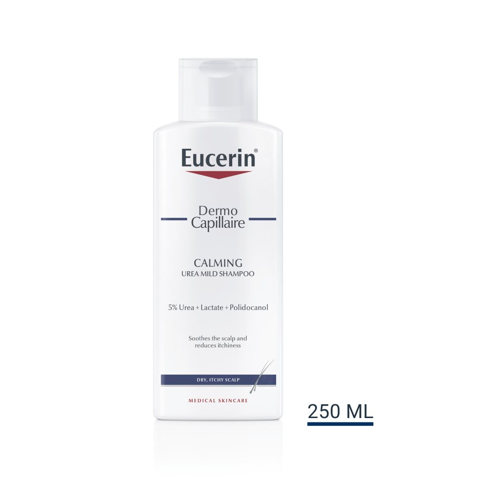 Eucerin DermoCapillaire Upokojujúci šampón s ureou bol vyvinutý špeciálne pre suchú a svrbiacu pokožku hlavy. Je obohatený o ureu a laktát – dve z hydratačných látok, ktoré si zdravá pokožka prirodzene vytvára – vďaka ktorým poskytuje suchej, svrbiacej pokožke potrebnú vyživujúcu starostlivosť. Obsahuje tiež upokojujúci polidokanol, ktorý pomáha zmierniť svrbenie a podráždenie. V kombinácii s Eucerin DermoCapillaire Upokojujúcim tonikom s ureou upokojuje a zmierňuje svrbenie a vysúšanie pokožky a zároveň vlasom dodáva zdravý lesk a pružnosť. Šampón je ideálny pre pacientov s lupienkou a atopickým ekzémom.