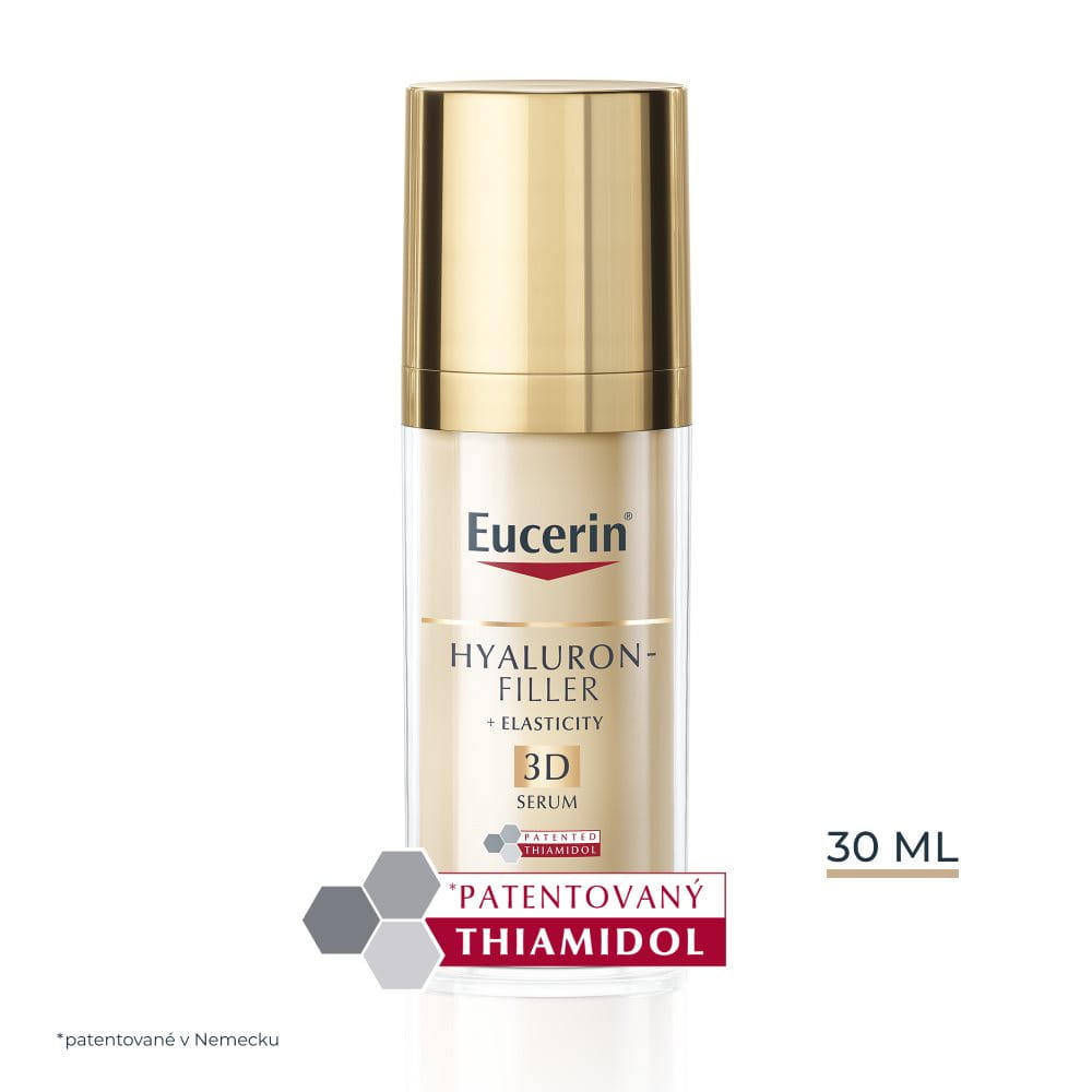 Eucerin Hyaluron-Filler + Elasticity 3D Sérum má klinicky aj dermatologicky preukázanú schopnosť zlepšovať pružnosť, redukovať pigmentové škvrny, viditeľne vyhladzovať hlboké vrásky a zanecháva pleť na pohľad aj na dotyk žiarivú a omladenú.