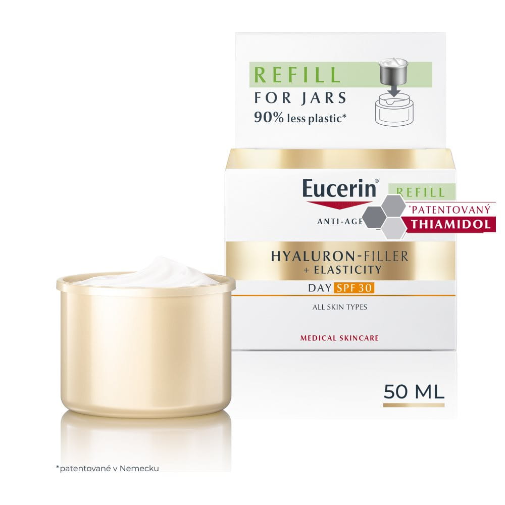 Tento HYALURON-FILLER + ELASTICITY SPF 30 NÁHRADNÁ NÁPLŇ obsahuje o 90 % menej plastu v porovnaní s bežnou Eucerin dózou s krémom na tvár. Používaním tejto náhradnej náplne môžete pomôcť znížiť množstvo plastového odpadu a prispieť k udržateľnejšiemu cyklu výrobkov. Kompatibilný so všetkými dózami Eucerin starostlivosti o pleť.
