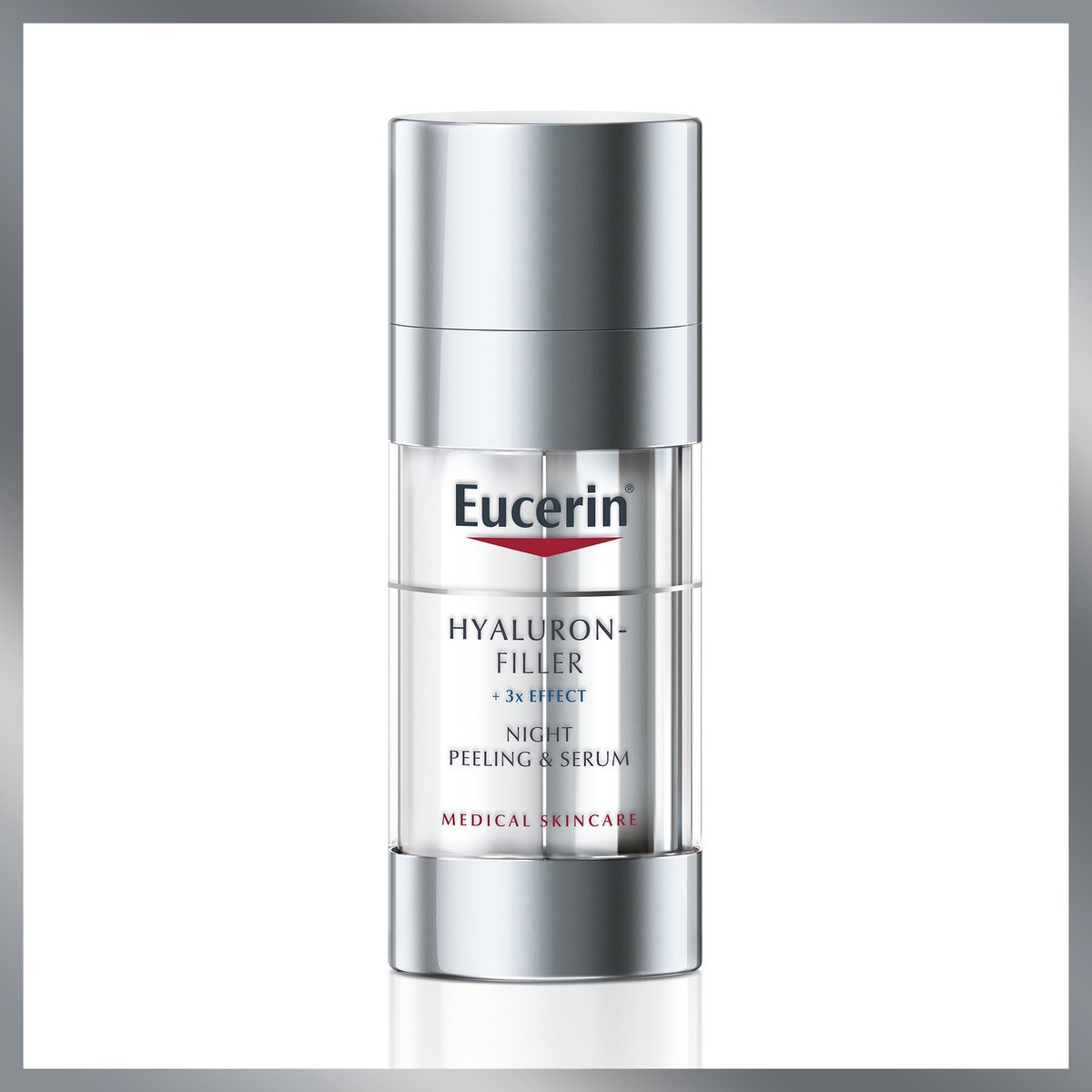 Na omladenie starnúcej pleti používajú dermatológovia injekcie s kyselinou hyaluronovou a chemické pleťové peelingy. Práve tieto postupy inšpirovali Eucerin Hyaluron-Filler Nočné obnovujúce & vypĺňajúce sérum, ktoré kombinuje dve účinné riešenia na dosiahnutie viacnásobného omladzujúceho účinku: