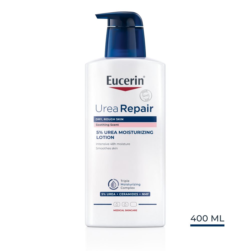 Eucerin UreaRepair Telové mlieko 5 % Urea s jemnou parfumáciou obsahuje ureu a ďalšie prirodzené hydratačné látky (ktoré viažu v pokožke vodu) a ceramidy (ktoré obnovujú kožnú bariéru a zmierňujú stratu hydratácie). Výrobok poskytuje okamžitú úľavu a odďaľuje známky typické pre veľmi suchú pokožku (napr. zhrubnutie a odlupovanie) až počas 48 hodín.